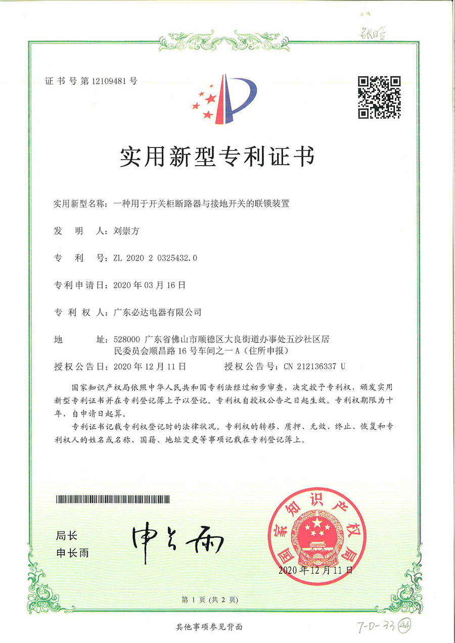 44.用于开关柜断路器与接地开关的联锁装置-实用新型专利证书(ZL 2020 2 0325432.0)2020.03.06